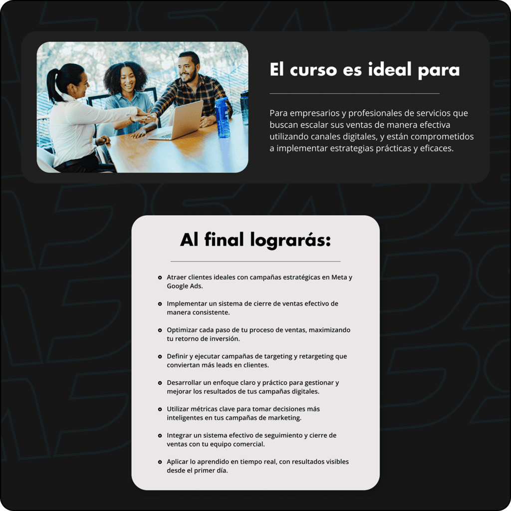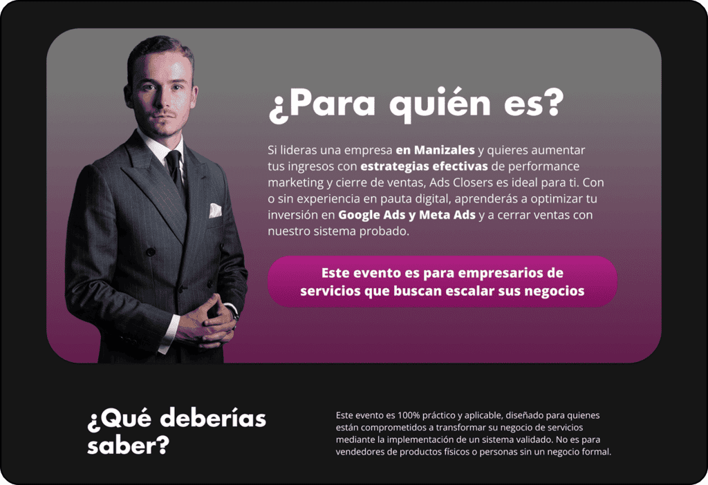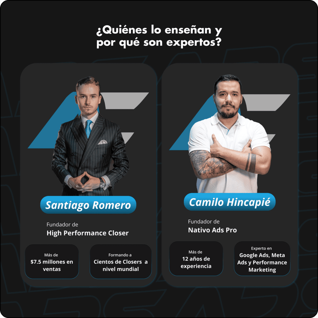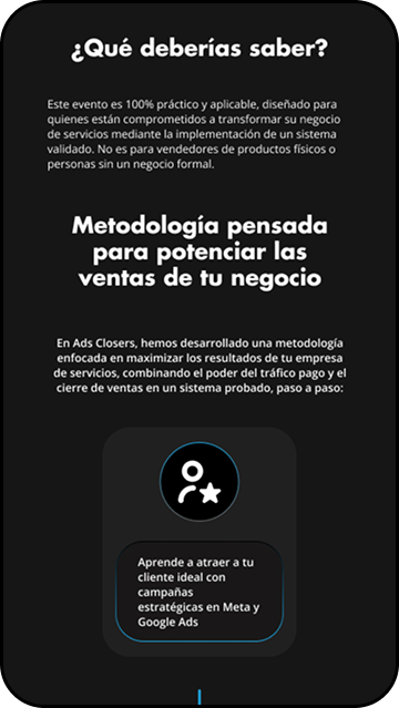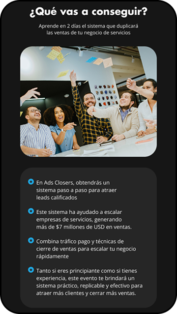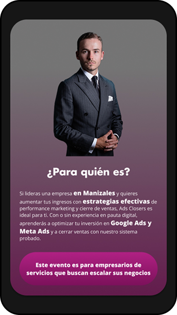 Esta landing se enfocó en una formación para vendedores y empresarios, estos buscaban en la formación aprender dos de las habilidades más fuertes en el mundo digital, la pauta en Google Ads y las diferentes plataformas y el cierre de ventas efectivo para productos high ticket, para esto se desarrolló la marca y se diseñó su Landing Page para atraer a su audiencia.