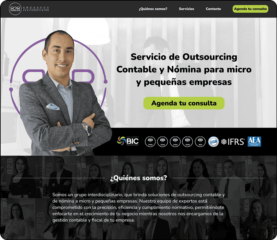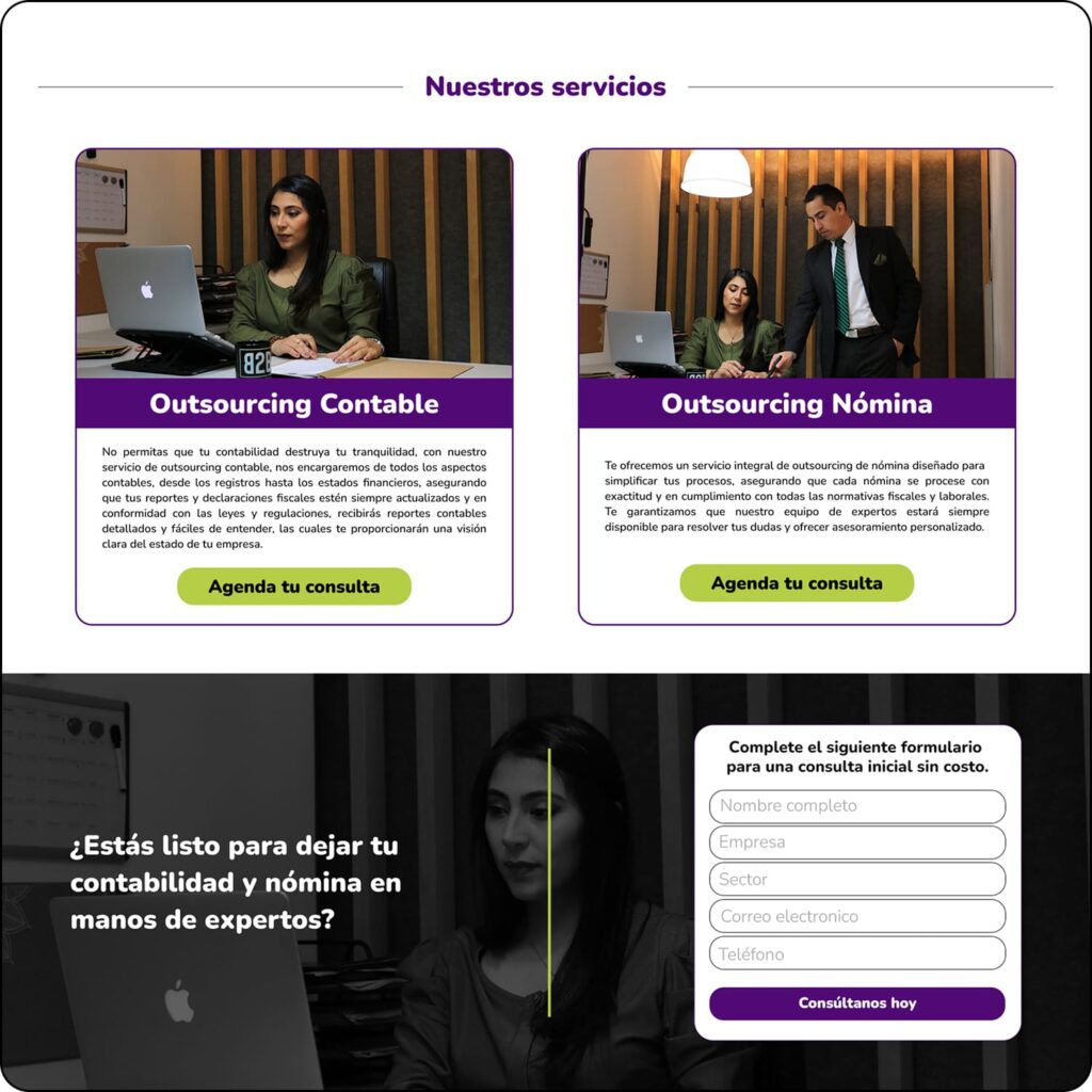 La empresa B2B se encarga de ofrecer diferentes servicios legales para empresas, en esta ocasión se decidió impulsar el ser servicio de Outsourcing Contable y Nómina para micro y pequeñas empresas, por esta razón se realizó el diseño de su Landing Page y una estrategía de Pauta digital para atraer clientes.