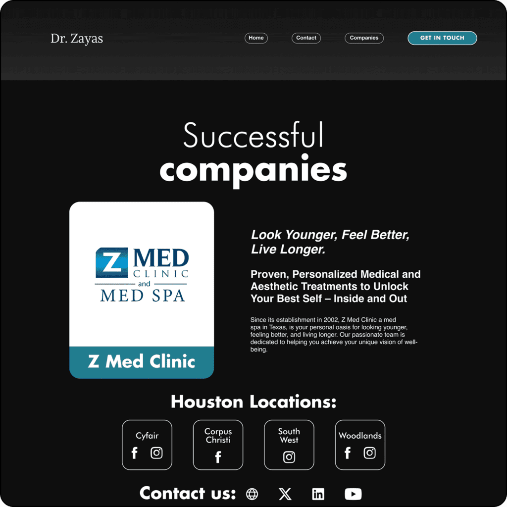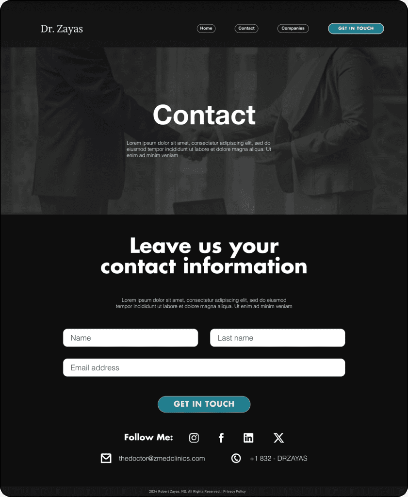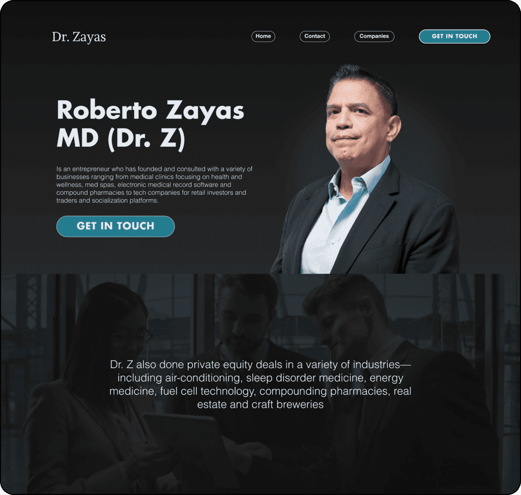 Este sitio web muestra la vida profesional y los estudios del Dr. Roberto Zayas, el cual posee múltiples reconocimientos y estudios en ámbito de la salud, esta web fue diseñada para atraer personas interesadas en hacer alianzas y negocios en sus empresas del sector médico.